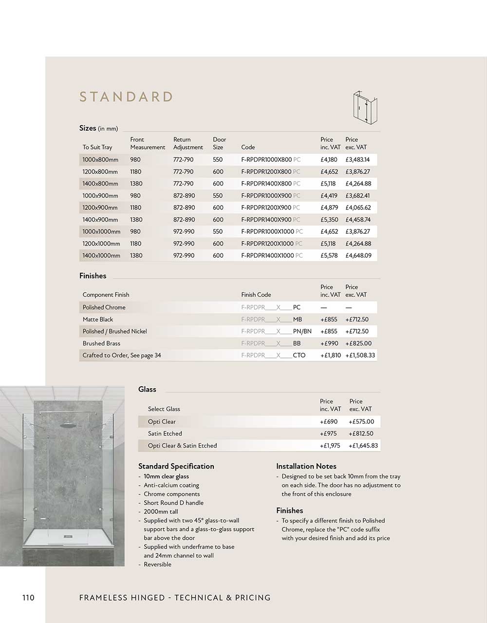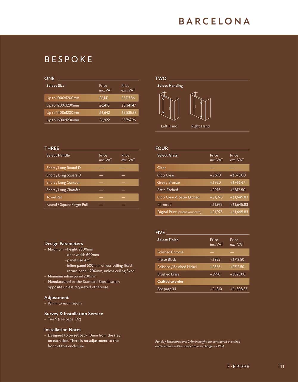 Shown Bespoke with chrome fittings, clear glass and long round D handle, ceiling brackets and surface mounted profiles with no underframe. Choose from our range of handles, glass, finishes and details below.