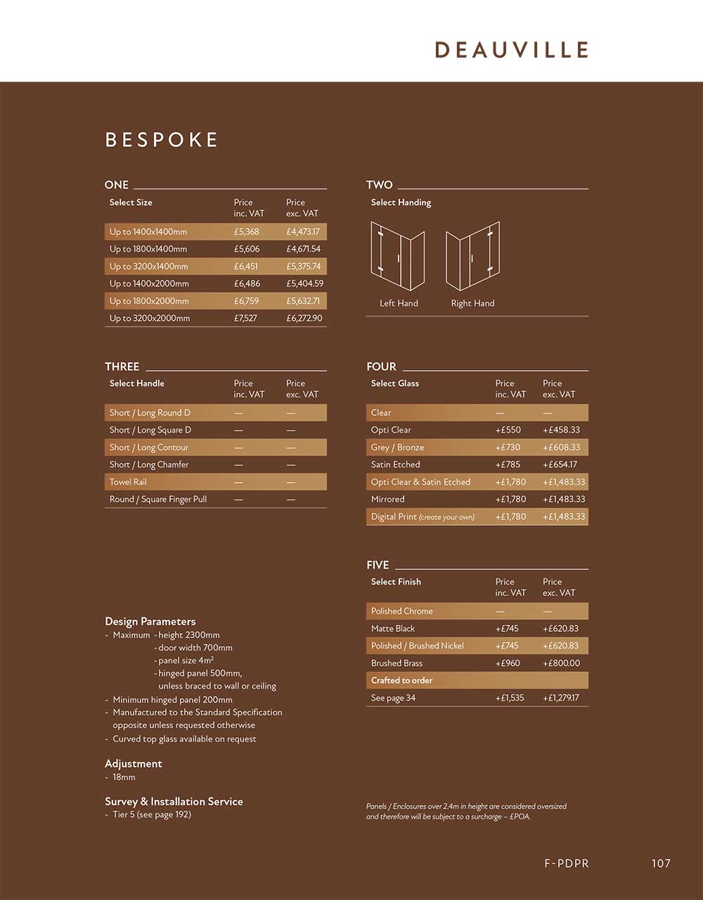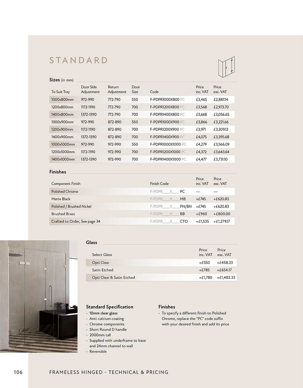 Shown Bespoke with chrome fittings, long round D handle and surface mounted profiles with no underframe and over a bath. Choose from our range of handles, glass, finishes and details below.