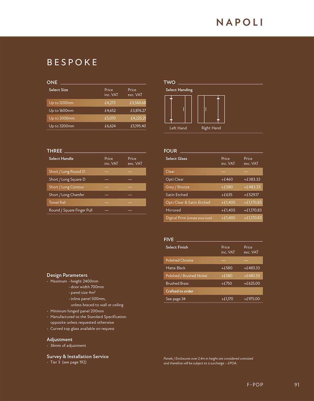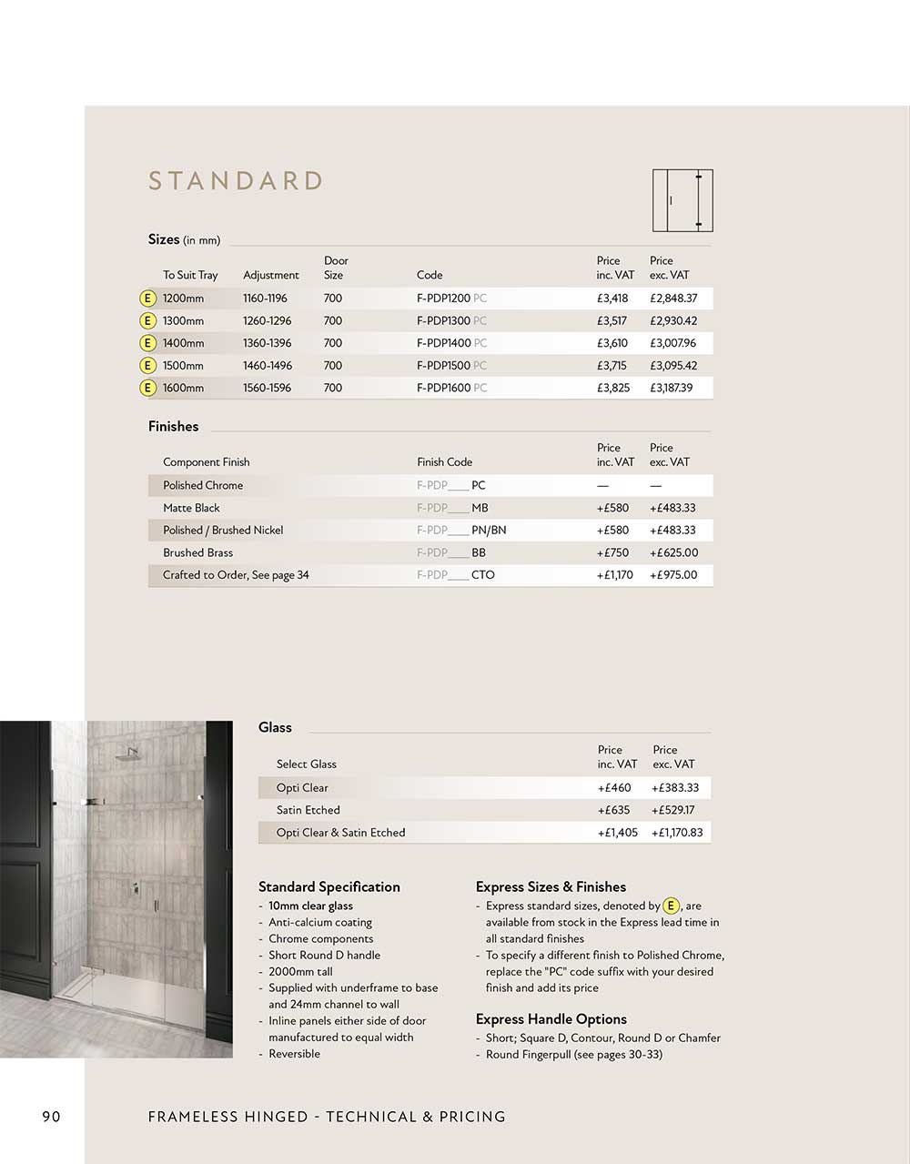 Shown Bespoke with chrome fittings and short round D handle. Choose from our range of glass, finishes and details below.