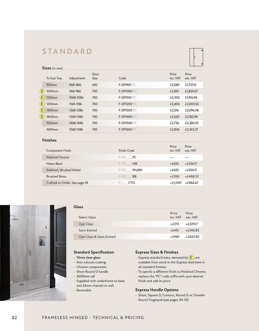 Shown Bespoke with chrome fittings, clear glass, surface mounted profiles, underframe to base and short round D handle. Choose from our range of handles, glass, finishes and details below.